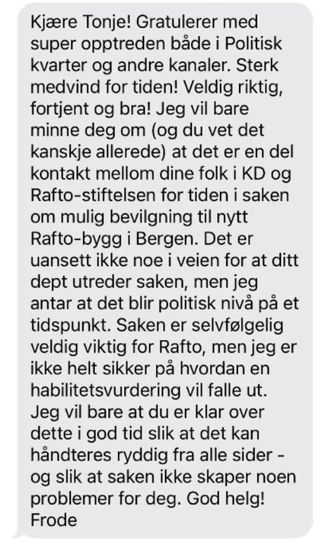 Dette fikk advokat Elgesem, også i forbindelse med en mulig bevilgning til et nytt bygg til Rafto-stiftelsen, til å minne Brenna om å sjekke sin habilitet overfor ham. Påminnelsen kom via en sms, datert 3. mars 2023, som VG gjenga i fjor: