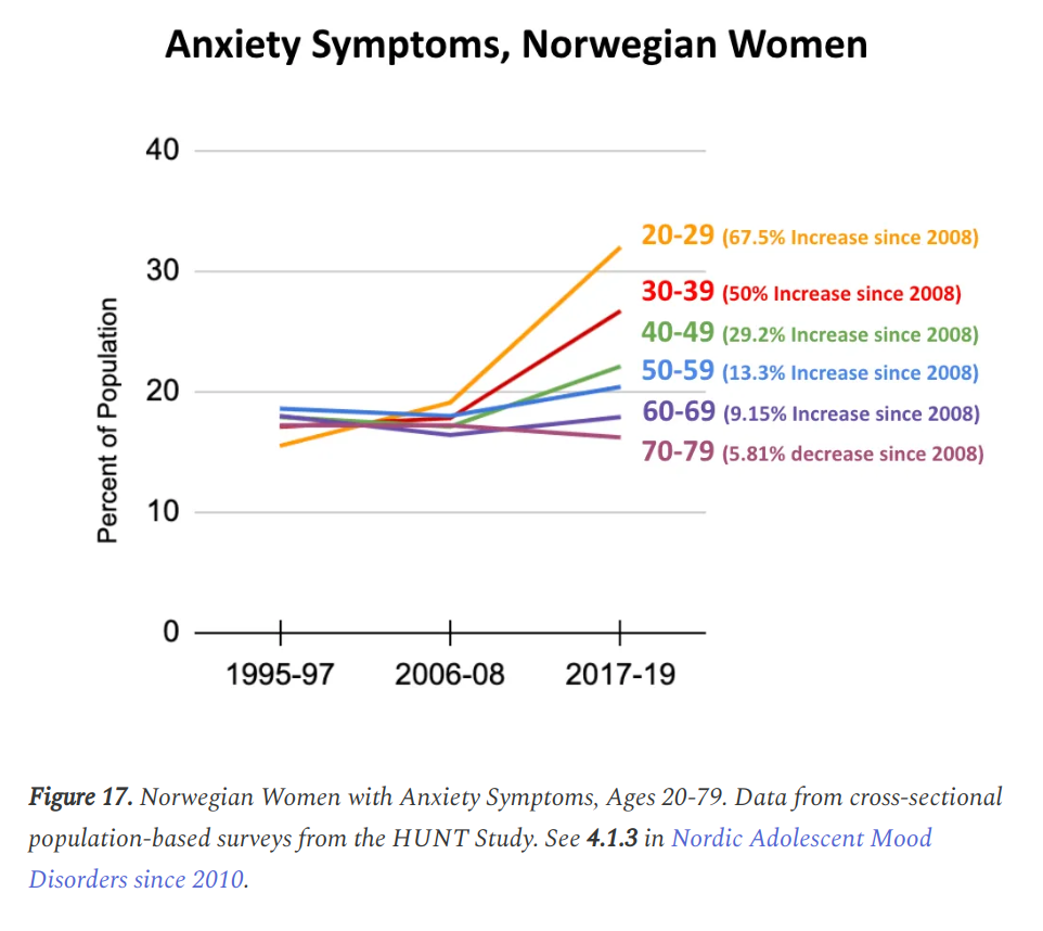 Forklaringen styrkes også av den sammenfallende helseforverringen over hele den vestlige verden. Haidt har til og med et eget lite avsnitt om Norge, basert på blant annet Ung-HUNT-undersøkelsen og Folkehelserapporten.