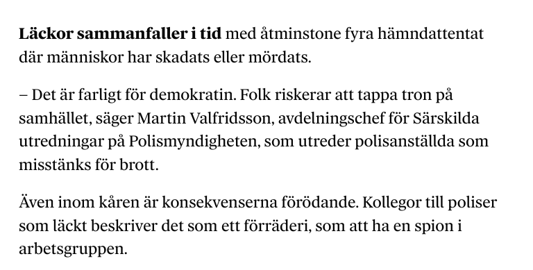 Siden 2018 er det avslørt 514 lekkasjer fra politiet til kriminelle i Sverige. Metodene gjengene benytter er effektive og utspekulerte, og avsløringene Dagens Nyheter har gjort bør være en vekker for Norge, ikke minst grunnet den store andelen kvinnelige studenter ved Politihøgskolen. 8 av 10 saker omhandler nettopp kvinner.