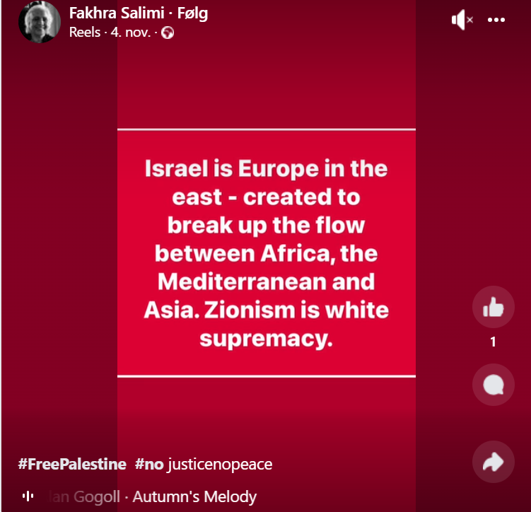 26. oktober i fjor skrev hun dette på Facebook-siden sin: «Alle barn har rett til trygghet og utviklingsmuligheter! From the river to the sea!» Alle barn, men åpenbart ikke jødiske barn. Det som ses som pro Palestina kan vanskelig være annet enn ren antisemittisme og jødehat forkledd som antikolonialisme.