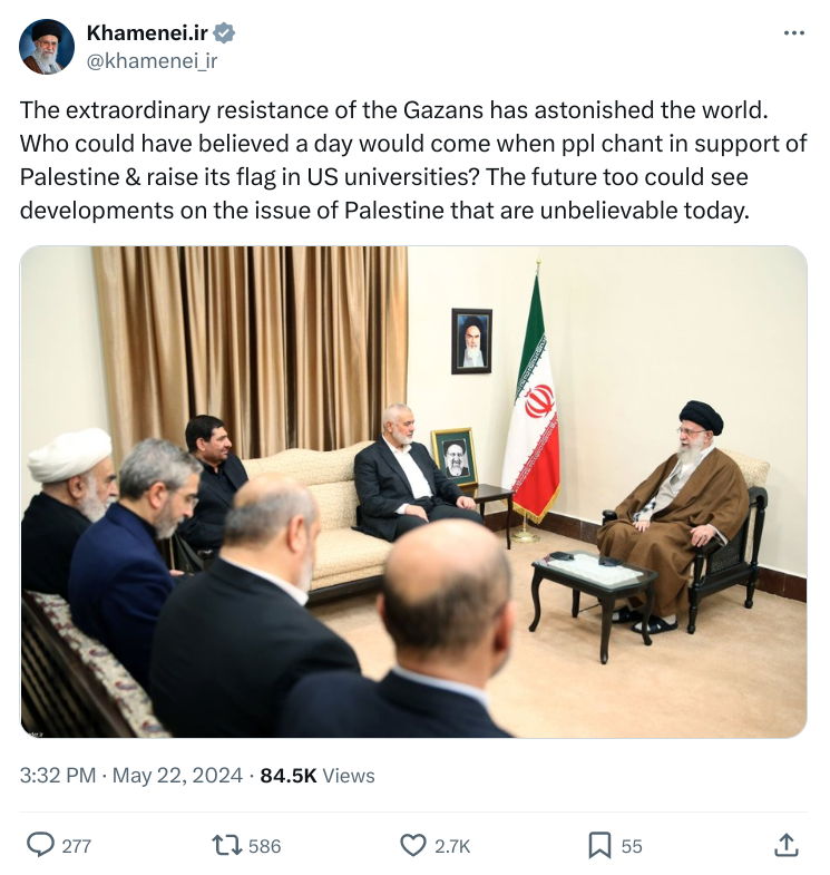 «Den ekstraordinære motstanden fra Gaza har forbløffet verden. Hvem hadde trodd at det ville komme en dag der folk synger til støtte for Palestina og heiser flagg på amerikanske universiteter? I fremtiden kan vi også få se en utvikling i spørsmålet om Palestina som framstår utrolig i dag», filosoferer den islamske republikkens øverste sharia-leder.