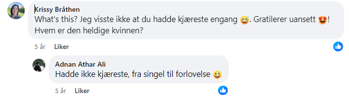 La oss ta en tur til Stortinget. Der har Athar Ali (Rødt) frekventert som medlem. Gift med kvinne i Pakistan, hentet hit. Nå har sønnen gått i farens fotspor, en sønn som er gjennomislamisert og uttalt motstander av demokratiet. Det er kun Allahs lover som skal gjelde. Han er arrangert gift med en kvinne i Pakistan, som fremdeles bor der. Han viser ikke bilder av henne, men dette er kvinnesynet hans. Og han har et barn med henne – tredjegenerasjon, altså norsk i SSBs statistikk, som nå vokser opp i Pakistan. Da han annonserte på Facebook at han hadde forlovet seg i 2019, uttalte en norsk kvinne følgende, og Adnan Athar Ali svarte henne:
