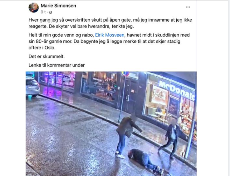 Denne ignoransen for «de andre» kom nettopp tydelig frem etter denne kommentaren fra Simonsen 23. april. I fullt alvor sier hun at det er helt greit at gjengkriminelle i Oslo skyter hverandre på åpen gate. Men nå skjedde det noe så vekket hennes uro: Hennes venn og pressekollega, Eirik Mosveen kom nylig i skuddlinjen sammen med sin eldre mor. Plutselig var ikke skytingen i Oslo noe som likevel ikke berørte henne: