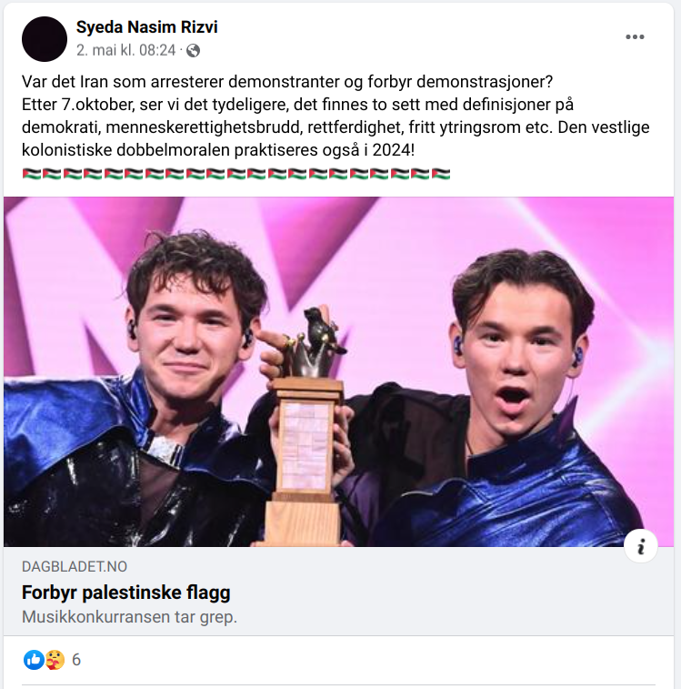 Da EBU, European Broadcasting Union, bestemte at det ikke vile være tillatt med palestinske flagg i salen under Eurovision, begrunnet i overhengende fare for opptøyer og vold, syntes Rizvi det var betimelig å kalle det «vestlig kolonistisk dobbeltmoral».