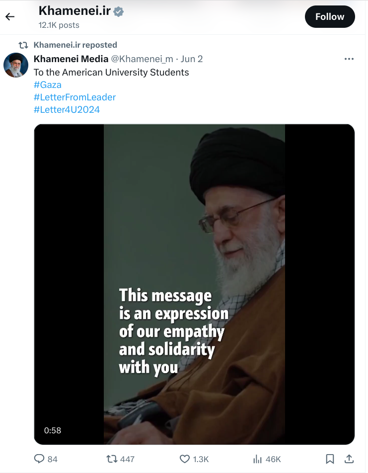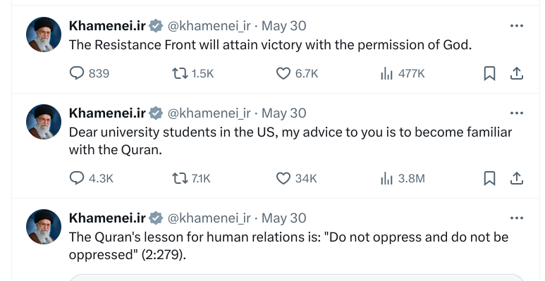 En som ikke er enig med Støre i at religion ikke har noe med krigen å gjøre, er den islamske republikken Irans høyeste åndelige leder, Ali Khamenei. På den engelske X-kontoen sin har han lagt ut en videohilsen til amerikanske studenter som demonstrerer for Gaza. Det er rimelig å anta at takken han gir dem også kan rettes mot andre vestlige demonstranter.