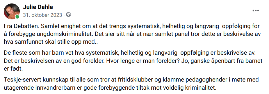 Men verken voldelige eller på andre måter omsorgssviktende foreldre blir i stand til å oppdra unger av at det kastes penger på alskens nye tiltak. Reell forebygging fordrer at det stilles krav til innvandrerforeldrene og at de sanksjoneres dersom de ikke evner å endre voldelig omsorgspraksis. I realiteten er det ikke gjengene som er ansvarlige for at 12-åringer rekrutteres til volds- og narkotikakriminalitet. Det er foreldrene. Jeg kan gjengi min egen Facebook-post fra høsten i fjor for å illustrere poenget.