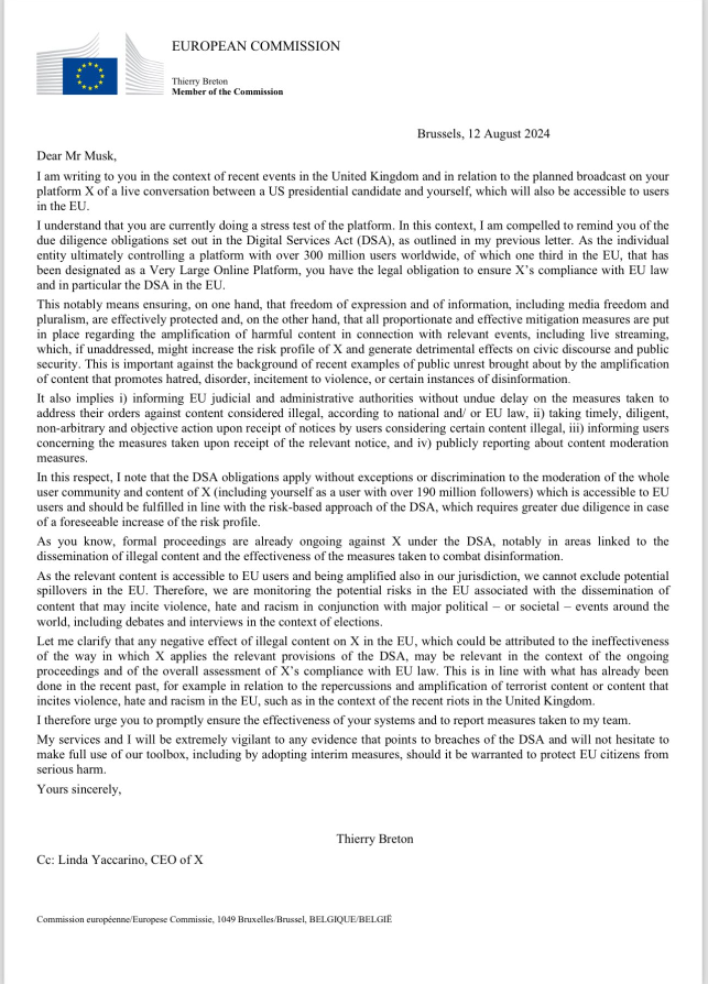 Det er en særdeles uklok tilnærming til X EU-kommisjonen ved Thierry Breton har tatt. Det har vært ulovlig å oppfordre til vold lenge før DSA (EUs Forordning om digitale tjenester, min anm.), så hvis noen gjør det, må det selvsagt straffeforfølges. På samme måte har det lenge før DSA vært ulovlig i alle land jeg noen gang har hørt om å avsløre statshemmeligheter. Det samme gjelder åpenbart injurierende innhold: det er allerede forbudt i alle siviliserte land.