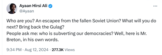 Hvem er du? En rømling fra det falne Sovjetunionen? Hva vil du gjøre videre? Få tilbake Gulag? Folk spør meg: hvem undergraver demokratiene våre? Vel, her er Mr. Breton, med hans egne ord, skriver Ali.