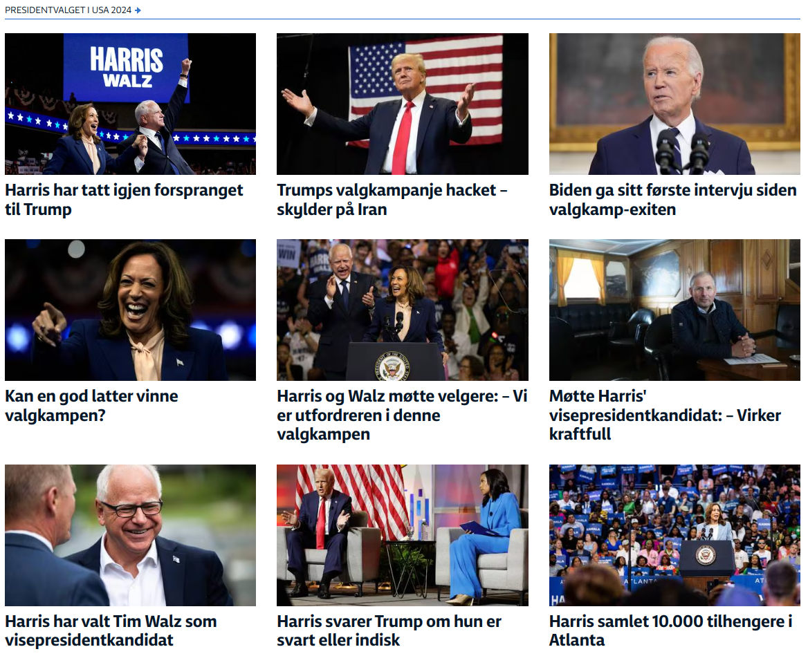 Saksutvalg vedrørende den amerikanske valgkampen er en annen form for taus sensur, der NRK tilsynelatende driver sin egen valgkampanje for Demokratenes Kamala Harris. Slik ser oversikten over «Presidentvalget i USA 2024» ut på NRKs nettsider: