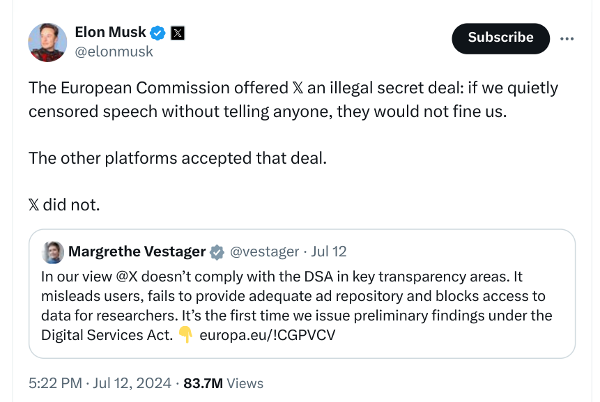 Så kan vi minnes at Musk allerede før europakommisærens trusselbrev hadde avslørt EU-kommisjonens forsøk på å inngå en hemmelig avtale med X forrige måned: