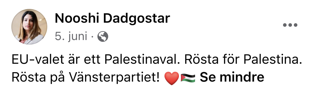 Dessuten har Nooshi Dadgostar gjort det helt tydelig at hun er pro-palestiner. Følgende bilde la hun ut på Facebook foran EU-valget, med tilhørende tekst: