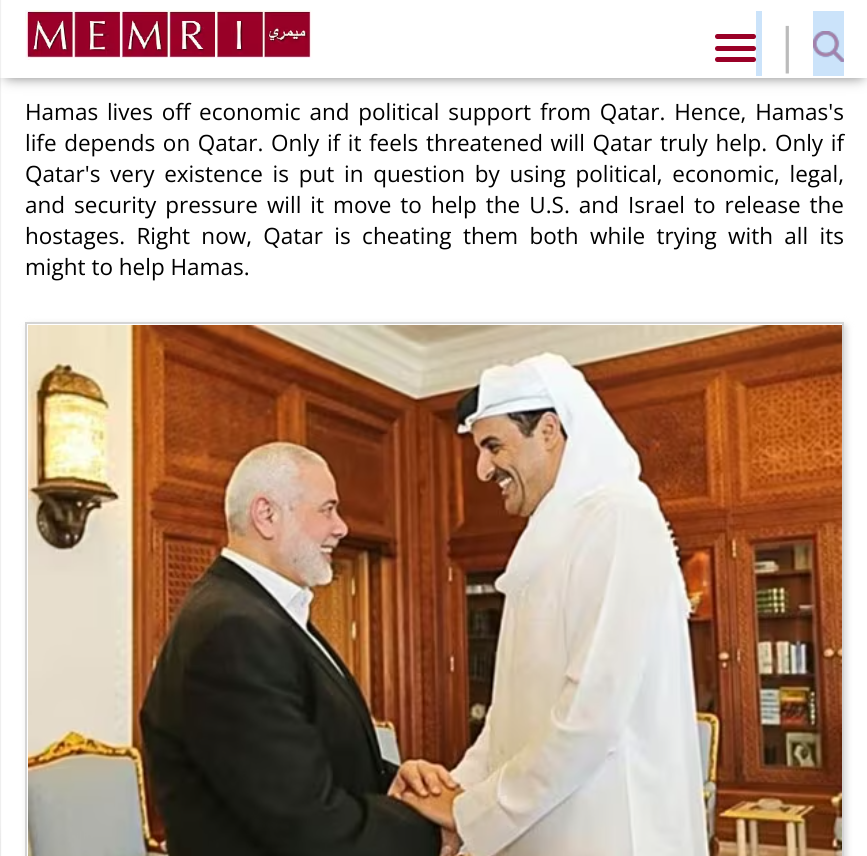 Også MEMRI er opptatt av Qatar – dog ikke av verken sportsvasking eller diplomativasking, men av Qatars jakt på makt og innflytelse, og MEMRI-sjefen selv går så langt at han påstår at Qatar er Hamas.