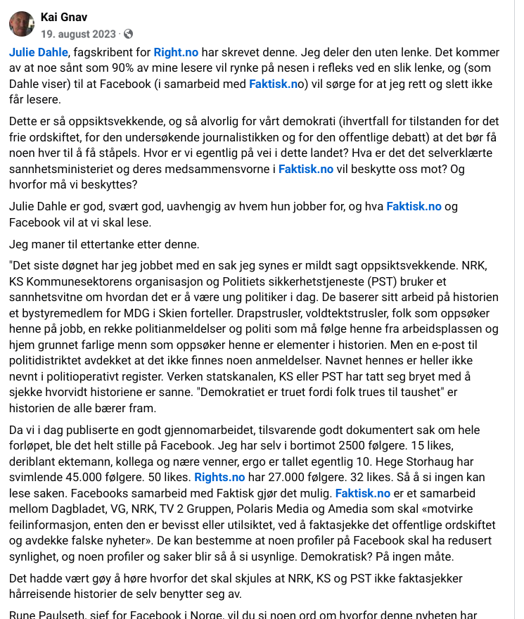 Min egen frustrasjon over sensuren klarte jeg likevel å gjenfinne ved et søk. En deling av frustrasjonen uten lenke til selve saken jeg skrev, delt av en nå avdød Facebook-venn, finnes fremdeles på nettet.