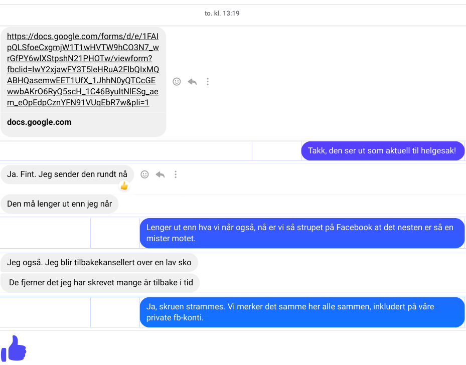 Da jeg delte saken på min egen Facebookside, ble den gjort nær sagt usynlig. Når jeg i dag skulle finne tilbake til min egen delte frustrasjon, finner jeg at hele innlegget er borte. Fjernet. Et fenomen jeg hørte om senest i går av en velkjent, norsk medieprofil, nå pensjonert. Han kaller det tilbakekansellering. Her fra vår samtale i går: