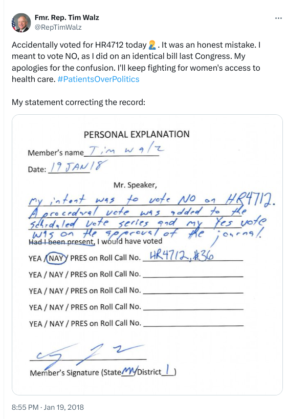 Det er eksempelvis fortsatt åpent for alle og enhver å klikke seg inn på X og lese hva Tim Walz twitret i januar 2018, da han var medlem av kongressen. Han ba faktisk offentlig om unnskyldning for at han ved et uhell stemte for det føderale lovforslaget om Born-Alive Abort Survivors Act.