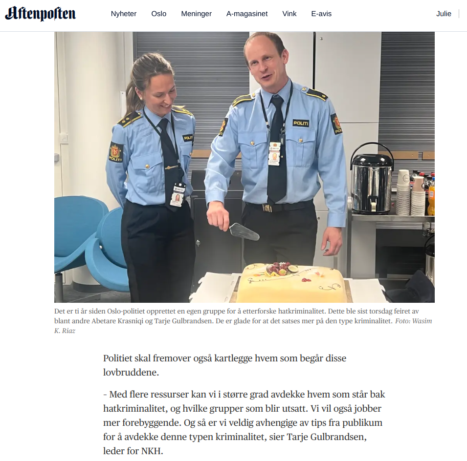Er du så uskolert at du reagerer med noen ord som er ulovlige i henhold til hatparagrafen på slik terrorhyllest, så er det nå det norske politiets uttalte mål at du skal anmeldes og dømmes i økende grad.