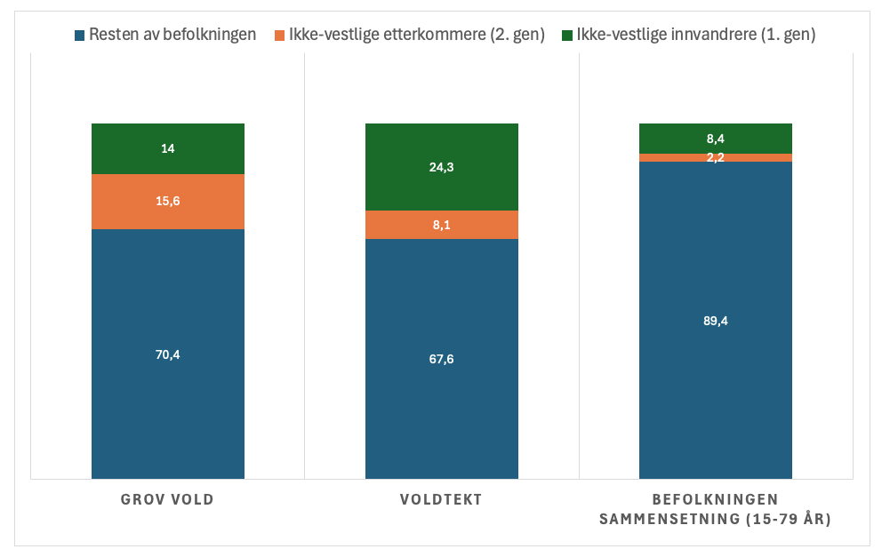 Av de dømte for grov vold i fjor hadde 29,6 prosent ikke-vestlig bakgrunn, altså nesten en tredjedel av de dømte for grov vold, mens de bare utgjorde 10,6 prosent av befolkningen. Andregenerasjon ikke-vestlige sto for 15,6 prosent av den grove volden, mens de utgjorde 2,2 prosent av befolkningen. Ikke-vestlige innvandrere utgjorde 14 prosent av de dømte for grov vold, mens de utgjorde 8,4 prosent av befolkningen.
