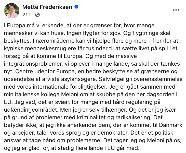 I går startet EU sitt toppmøte, der Giorgia Meloni og den danske statsministeren Mette Frederiksen var vertskap på et formøte for en gruppe EU-land som alle er enige om å jobbe for «nye innovative løsninger» for å redusere antall migranter. At Frederiksen hadde den rollen er naturlig all den tid Danmark over tid har jobbet med en tredjeland-løsning, der de hat tatt initiativ overfor 15 Eu-land for en slik løsning. I tillegg har Danmark vært en av de mest kreative for å begrense den ikke-bærekraftige innvandringen.