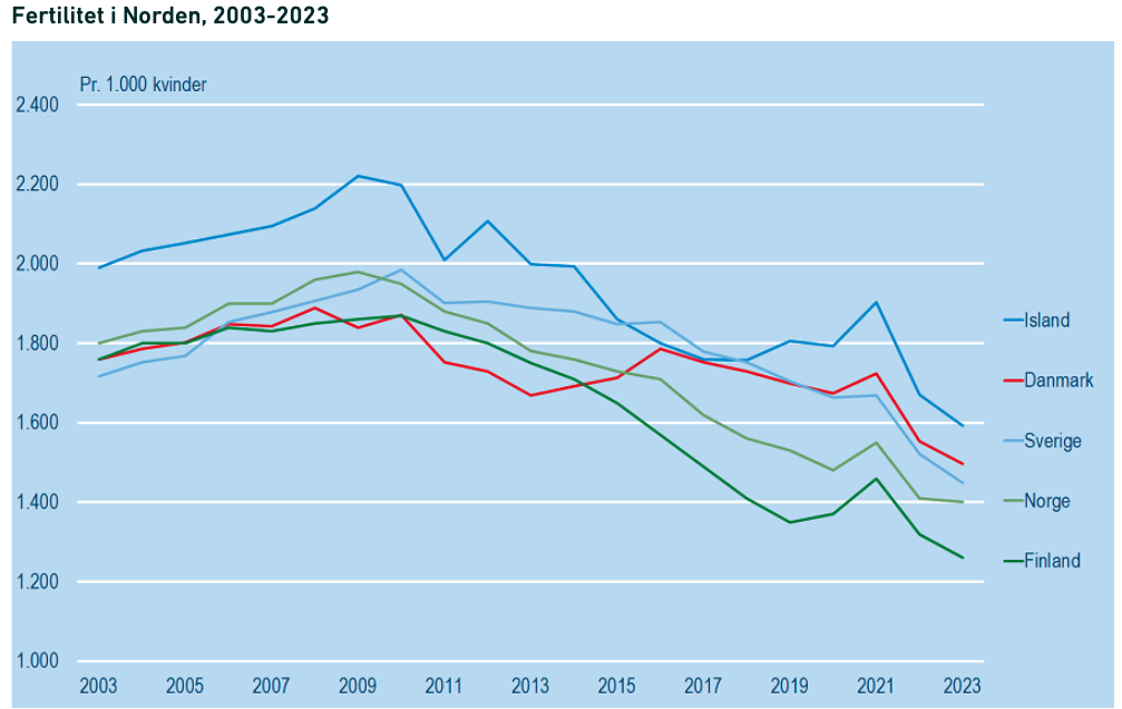 Etter det lille oppsvinget etter koronatidens restrikasjoner, peker pilene bratt nedover igjen. Ingen av de nordiske landene, med unntak av Island, har på 20 år (fra 2003) vært over 2.000 barn per 1.000 kvinner.