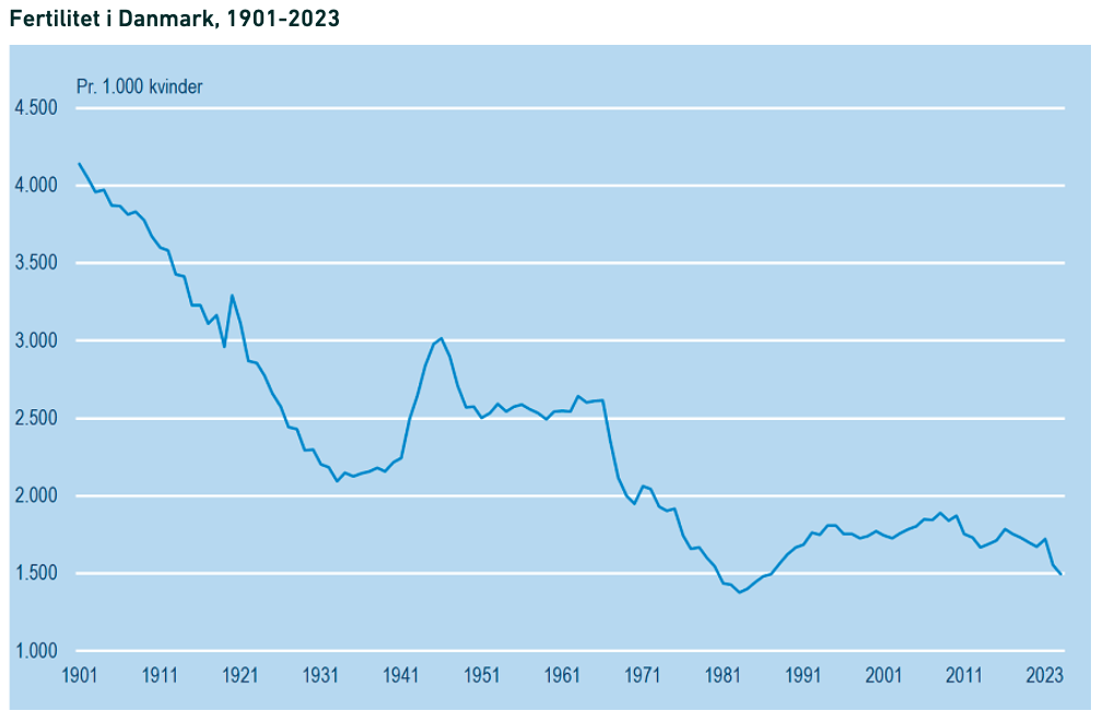 Ser vi enda lenger tilbake til statistikkens start i 1901, hvor Danmark hadde en fruktbarhet på 4.140 barn per 1000 kvinner.