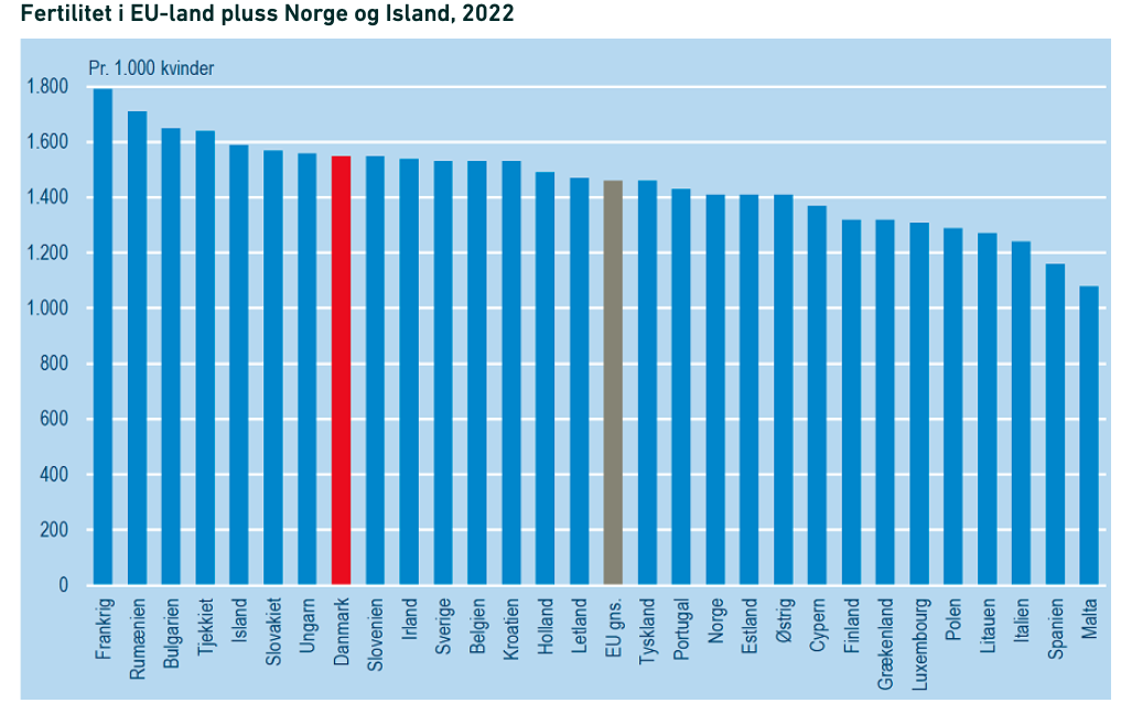 Ser vi på EU-landene, i tillegg til Norge og Island, er det like begredelig. I 2022, som er det siste statistikkåret fra Eurostat, når ingen opp til reproduksjonsnivået. På topp ligger Frankrike og Romania, men vi i andre enden finner Malta og Spania. EU-gjennomsnittet ligger på 1.460 barn per 1.000 kvinner.
