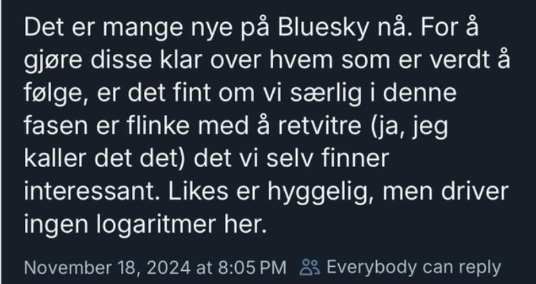 En annen morsom observasjon er hvordan de som reiser videre til Bluesky insisterer på at plattformen er for «alle» – samtidig som det er uhyre viktig at «de andre» holder seg unna. De andre, i denne konteksten, er gjerne høyresiden, skeptikere eller generelt folk som kan finne på å si noe litt for edgy. For en plattform som ønsker å være en åpen, demokratisk oase, har den en mistenkelig lav toleranse for dem som ikke kan sitere Judith Butler på sparket.