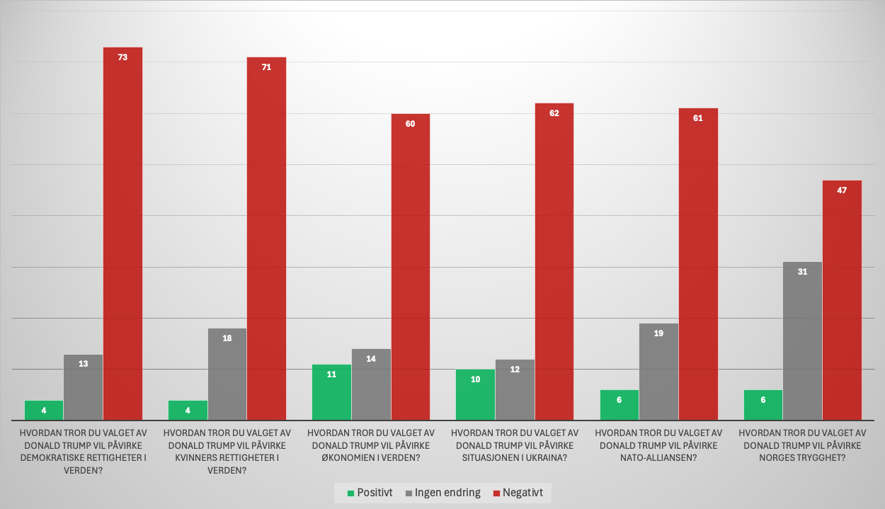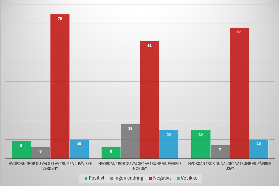 «Et flertall her hjemme tror valget av Trump vil slå negativt ut på en rekke områder i verden. Tre av fire svarer dette på en undersøkelse …». Etterfulgt av et utsagn fra et par bekymrede ungdommer.
