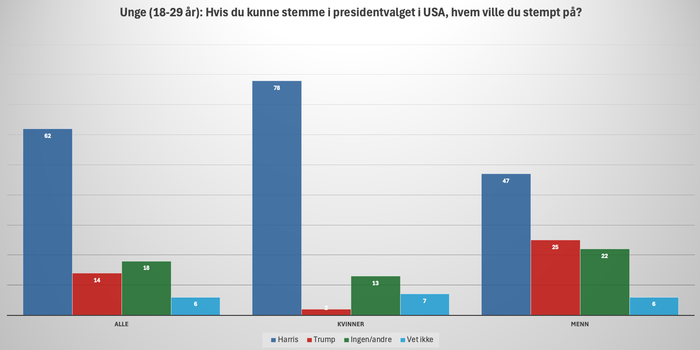 Mens det var 110 unge i utvalget før valget, er det denne gangen 430 unge. Og der det var 47 prosent unge, norske menn som ville stemt på Trump før valget, sier denne undersøkelsen 25 prosent. Det kunne like godt vært etterfulgt hos NRK av et lettelsens Puh!