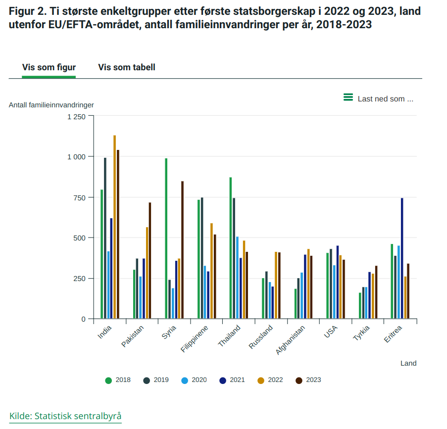 Her er det India, Pakistan og Syria som utmerker seg, og da spesielt Syria, der antallet familieinnvandrede har mer enn doblet seg fra 2022 til 2023. SSB presiserer: