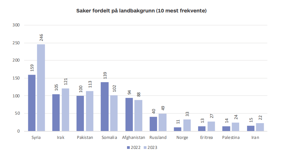 Før 2022 har det vært få saker med denne bakgrunnen som gjelder «ufrivillig opphold i utlandet» og «frykt for ufrivillig opphold i utlandet». Fra 2022 til 2023 har hovedbekymringskategorien «ufrivillig opphold i utlandet» blitt mer enn tredoblet, fra 12 i 2022 til 39 i 2023. Det har også vært en økning i antall saker der personen det er bekymring for befinner seg i utlandet fra 21 saker i 2022 til 34 saker i 2023. Økningen kan muligens være et tegn på at personer med bakgrunn fra Syria nå i større grad reiser tilbake til Syria eller naboland som Irak og Tyrkia. Økt reiseaktivitet kan også ha sammenheng med at flere har vært i Norge så lenge at de har fått norsk statsborgerskap og norsk pass.