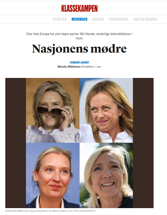 I Klassekampen skrev nylig selverklært feminist og kjønnsforsker Wencke Mühleisen at «over hele Europa har ytre høyre-partier fått blonde, moderlige lederskikkelser i front». Bildearrangementet til avisen viste med all tydelig hva det gikk i, der underteksten til bildet er «blond og blondere».