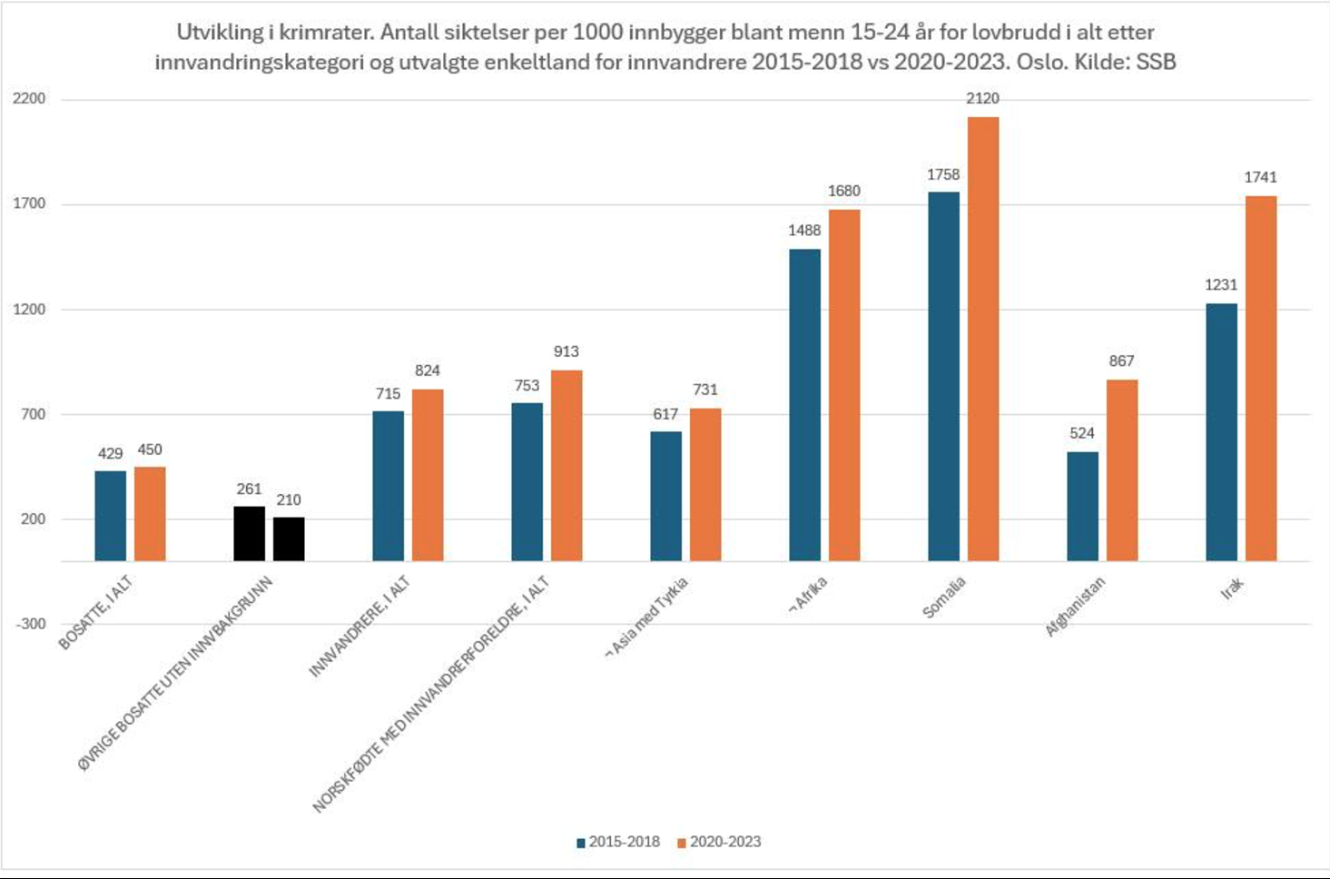 Som FrP-leder Sylvi Listhaug sier på sin FB-side viser tallene at kriminaliteten blant nordmenn uten innvandrerbakgrunn går ned, mens kriminaliteten blant de med innvandringsbakgrunn øker. For menn 15–24 år var overrepresentasjonen i siktelsesrater i perioden 2015–2018 på 53 og 59 prosent for henholdsvis innvandrere og norskfødte med innvandrerforeldre. I 2020–2023 var overrepresentasjonen økt til 96 og 124 prosent.