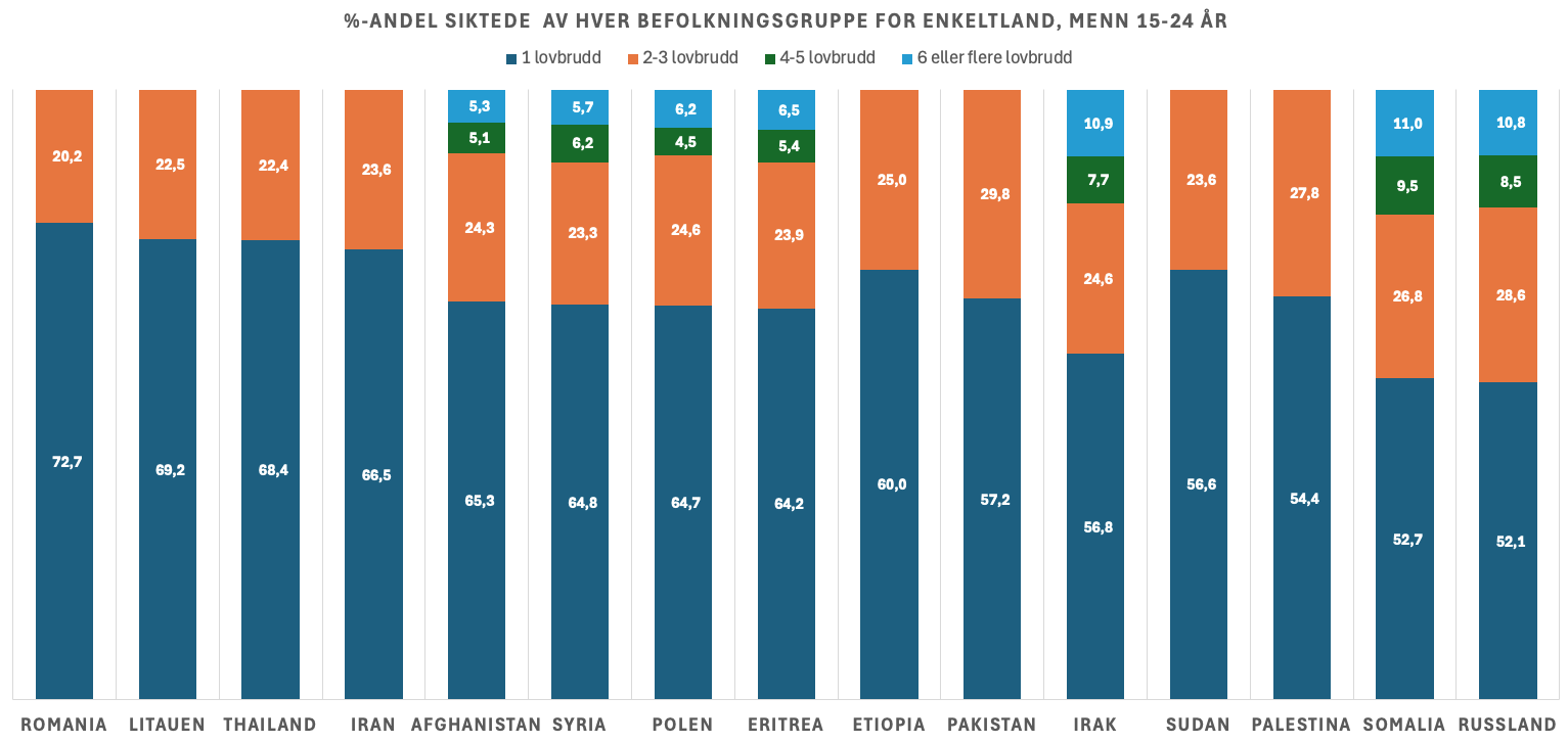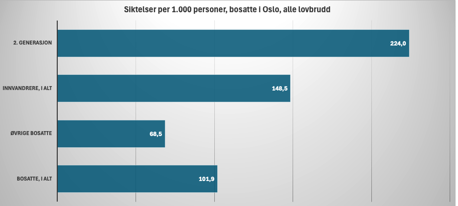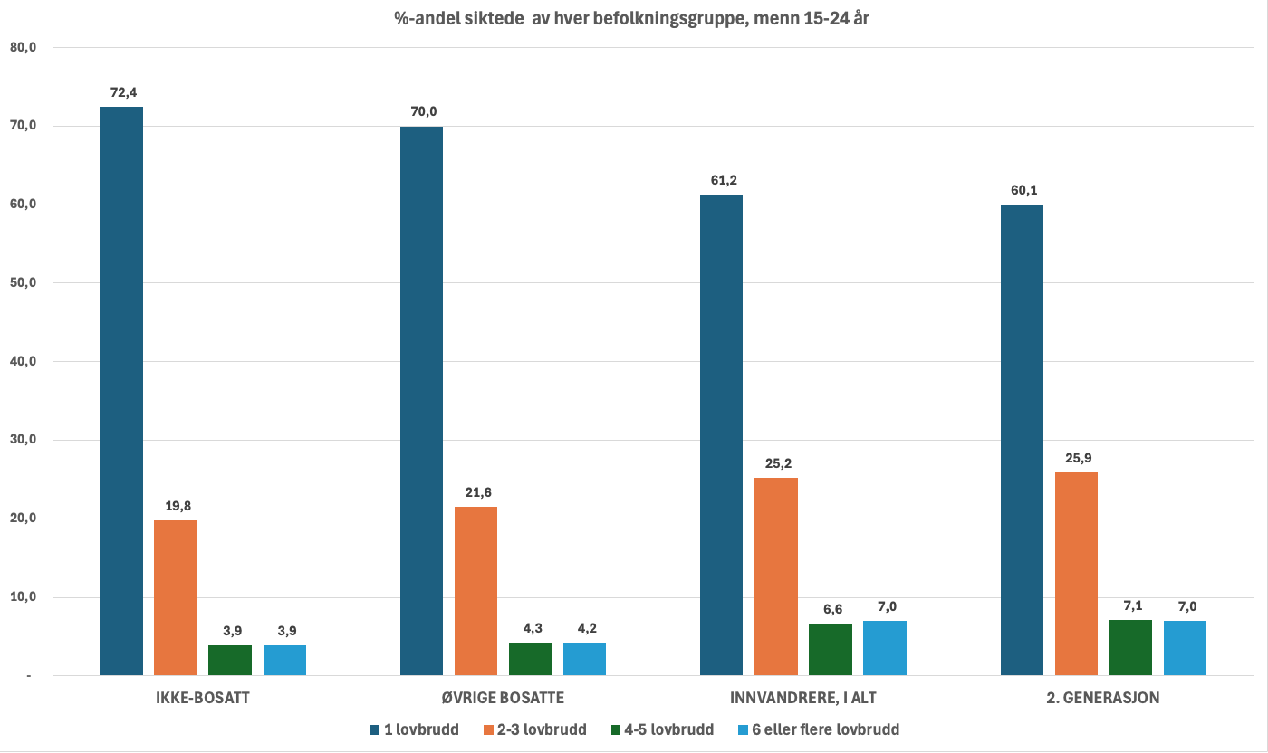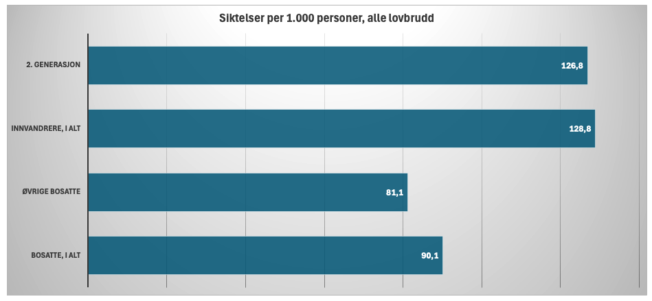 Som SSB påpeker var det nærmere 130 siktelser per 1.000 innbyggere for henholdsvis innvandrere og norskfødte med innvandrerforeldre (2. generasjon) bosatt i 2020–2023, men raten litt over 80 per 1.000 for øvrig befolkning. «Det er dermed en overrepresentasjon på i underkant av 60 prosent for personer med innvandrerbakgrunn sammenlignet med personer uten innvandrerbakgrunn.»
