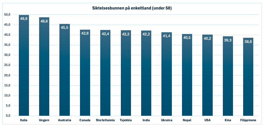 Ser vi på siktelser ut fra enkeltland kan vi lage en topp og bunn oversikt: