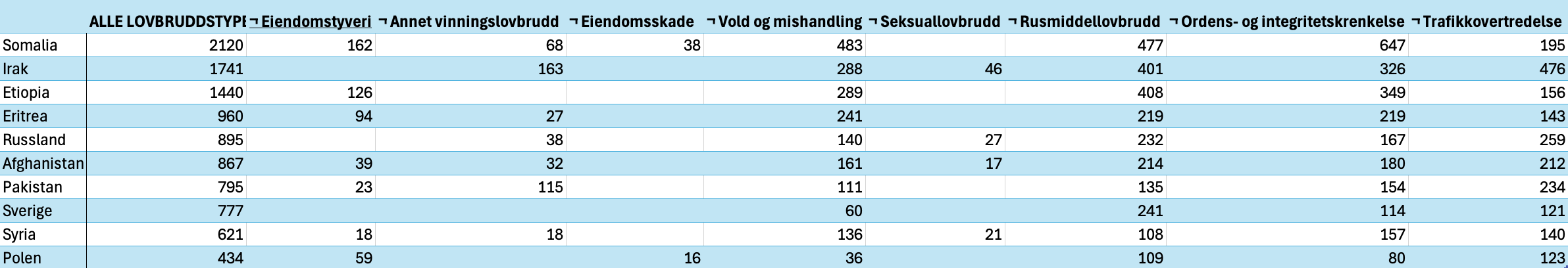 Hele 1.947 siktelser handler om vold og mishandling, hvor også samtlige land er representert. Dette er stygge tall, med Somalia er på topp, fulgt av Etiopia, Irak og Eritrea. Blant øvrige bosatte (altså uten innvandringsbakgrunn) er det 32 siktelser per 1.000 for vold og mishandling.