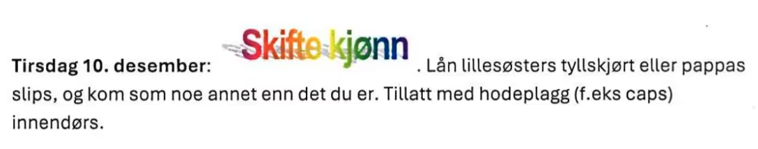 Og hva svarer konstituert rektor? Jo, at valg av ordet «skifte kjønn» ikke var heldig. Det burde vært endret til «kom som noe annet enn du er-dag». Men hvorfor i all verden skal småbarn være noe annet enn det de er? Skolen ser ut til å ha en tro på at hvis du er noe annet enn det du er, så vil du lære mer om likestilling og likeverd. Hadde noen av barna malt seg svarte i fjeset ville de neppe blitt møtt med annet enn fordømmelse.