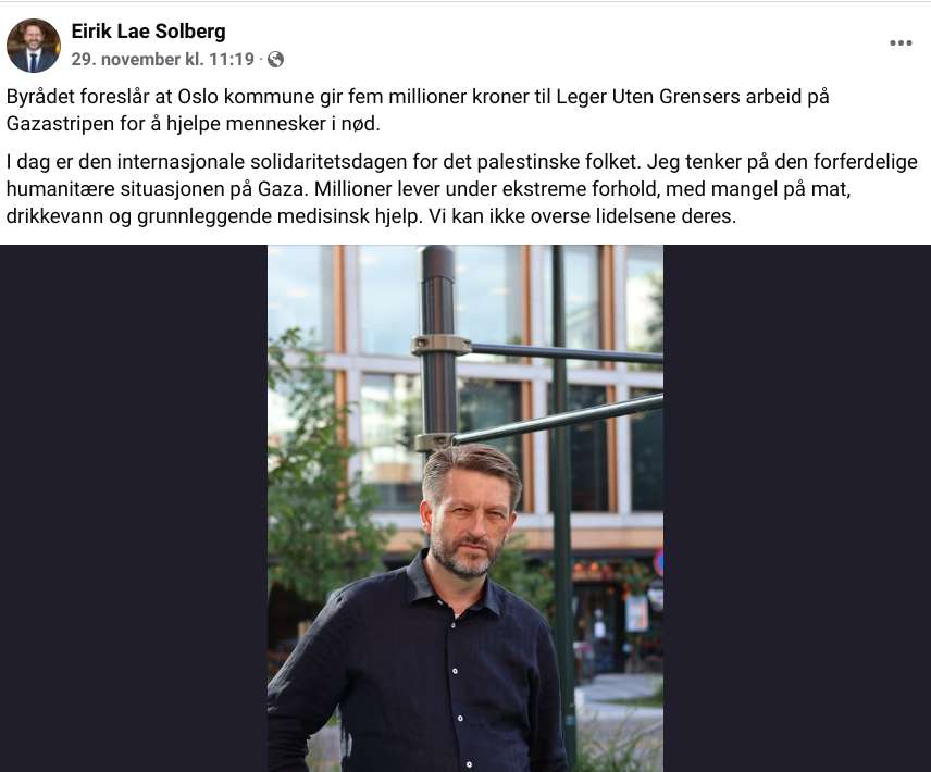 Det er noe symboltungt ved å se byrådsleder Erling Lae Solberg fronte en gave på 5 millioner kroner til Gaza samtidig.