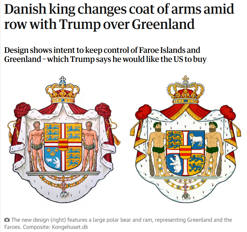 Man trenger ikke ha som livsfilosofi at alt og alle er til salgs for å ønske seg Grønland. Danmark selv pusser fjærene overfor øya der majoriteten ønsker selvstendighet. Danskekongen har sågar endret våpenskjoldet for å vise hvor tilknyttet landet er, slik faksimilen fra mandagens artikkel i The Guardian viser: