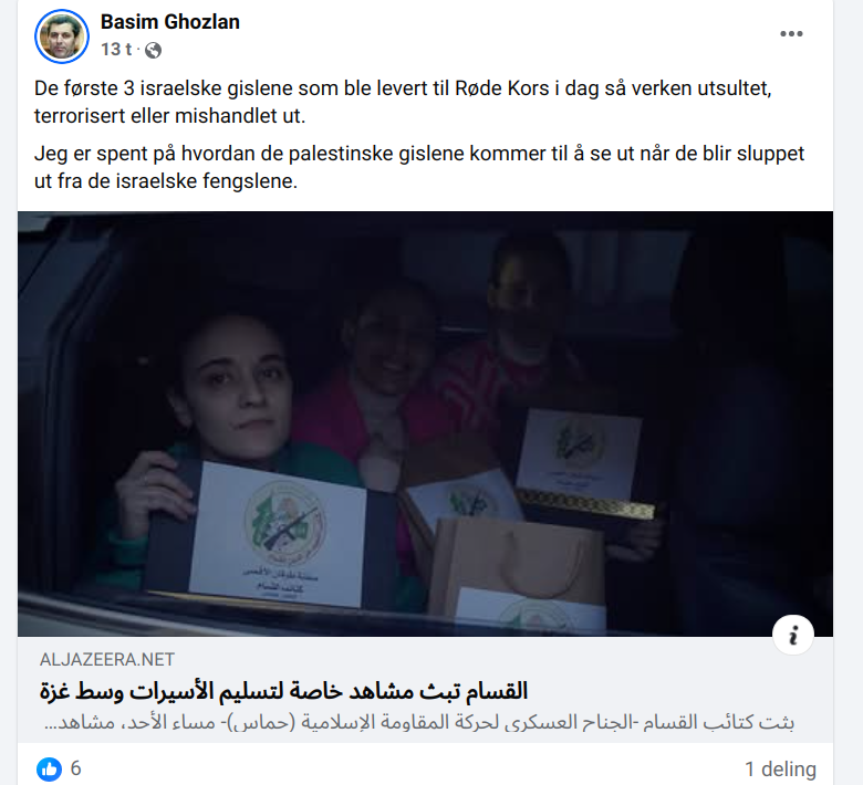At de israelske gislene er sivile som aldri har angrepet noen synes ikke å vekke noen tanker hos Ghozlan. Hva de palestinske fangene har utført synes heller ikke verdt å nevne. Det er israelsk ondskap og Vestens rasisme som er den velkjente melodien, og med sittende regjering er det ikke underlig at man kan forholde seg slik til virkeligheten. Støre-regjeringens forståelse er slett ikke langt fra Ghozlans, der de under pågående krig erklærte sin egen anerkjennelse av Palestina som stat.