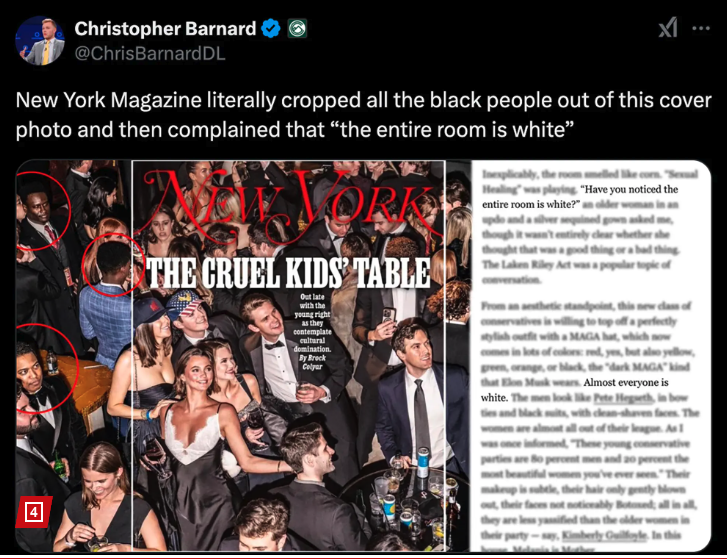Dette merket (den konservative) kommentatoren Christopher Barnard seg. Han avdekket i New York post at NYmag åpenbart hadde en agenda her, med følgende bilde på X: