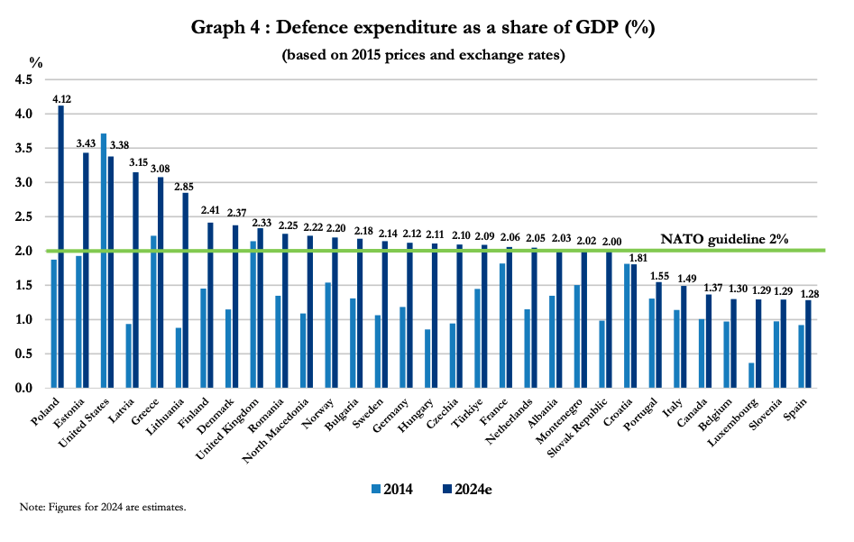 For år 2024 er Polen sterkest, rundt 4,1 år prosent (stipulert):