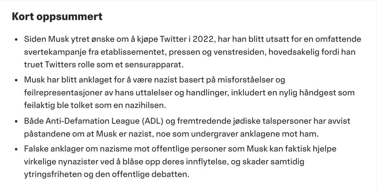 Er det virkelig noen som tror jødene føler seg tatt i forsvar av en venstreside som retter sine moralske pekefingre mot Musk? Den samme venstresiden som har umåtelige vansker med å forstå at Hamas ønsker å slette Israel fra kartet skal altså posere som jødenes forsvarere? Det er et påfallende hyklersk standpunkt.