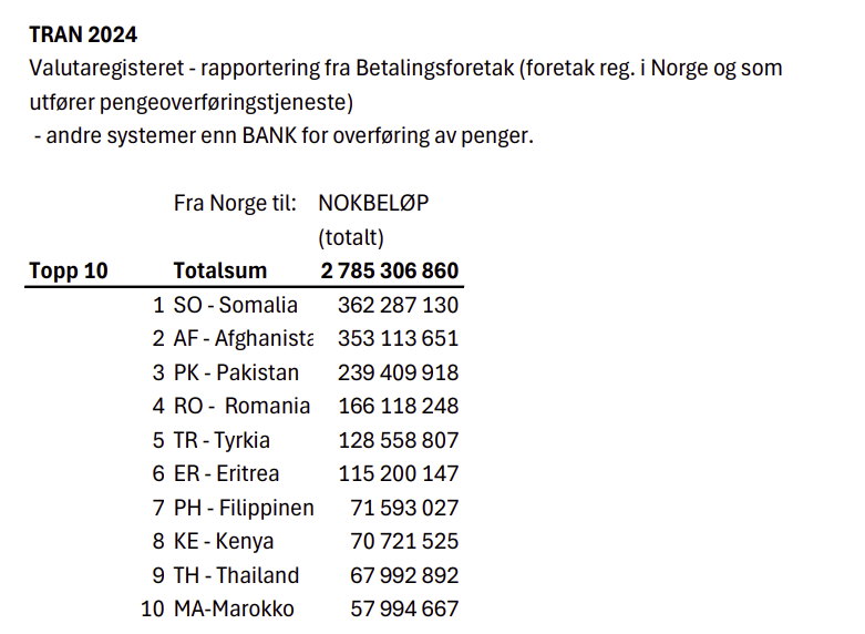 HRS har som eneste instans nok en gang hentet ut tall fra Skatteetaten ved Valutaregisteret over pengetransaksjoner fra privatpersoner her til privatpersoner i utlandet, denne gangen for hele 2024.