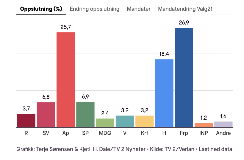 Vel så interessant er det at FrP, som fortsatt er landets største parti, går frem 1,8 prosentpoeng til 26,9 prosent.