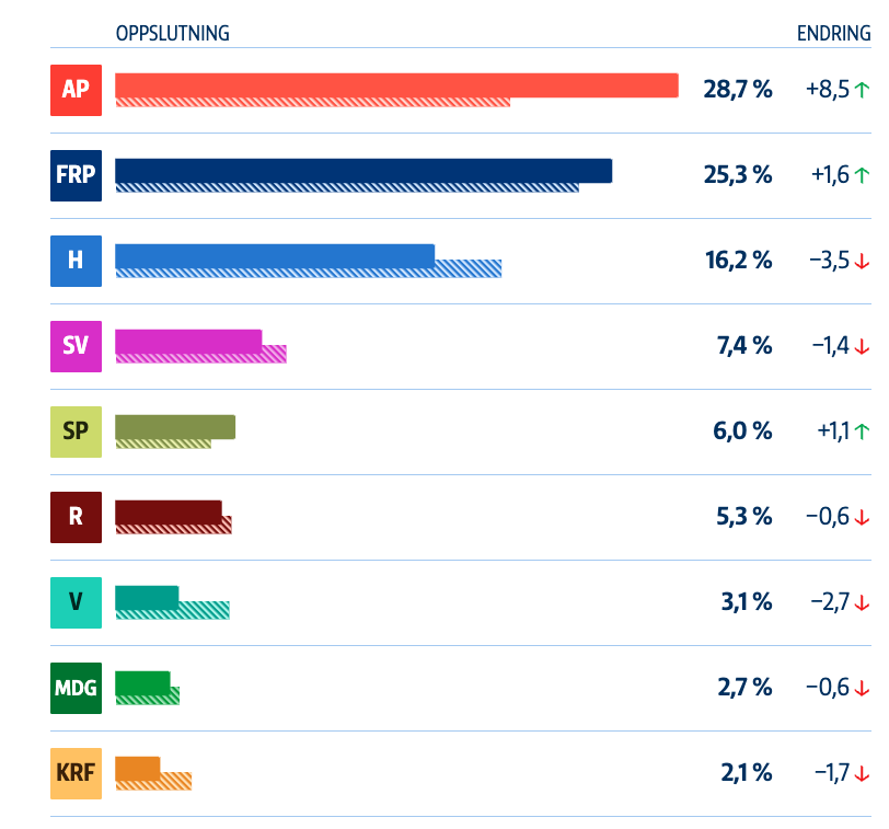 Sammenligner vil denne målingen med valgresultatet i 2021 er det imidlertid FrP som er den store vinneren. De har en fremgang på 13,7 prosentpoeng, mot Aps 2,5 pp. Den store taperen er Sp med en tilbakegang på 7,5 pp, deretter følger Høyre med en tilbakegang på 4,2 pp.