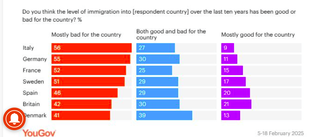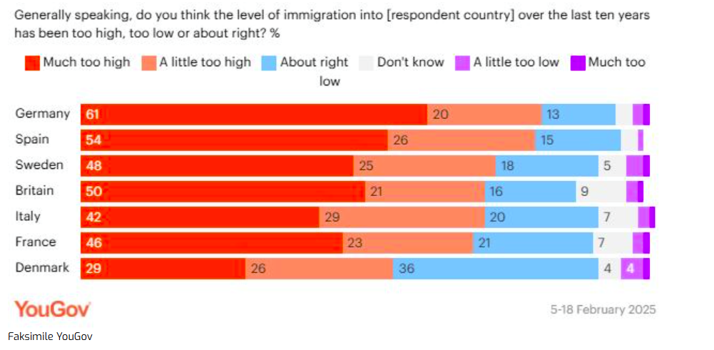 YouGov har foretatt måling i sju vesteuropeiske land. Tallenes tale er ikke til å misforstå. De fleste sier at innvandringen har vært «alt for høy».