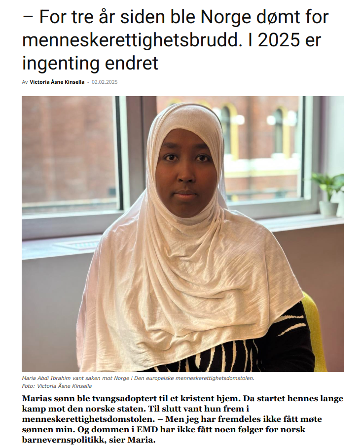 I Norge preges mediedekning av EMD-dommene av en vinkling der foreldrene i barnevernssakene løftes fram som ofre for en statens overgrep. Maria Abdi Ibrahims sak er intet unntak. Saken har blant annet blitt profilert i Dagbladet, Fri Fagbevegelse og fagbladet Fontene i forbindelse med EMD-behandling, mens Utrop velger å løfte den atter en gang – tre år etter. Faksimilen viser vinklingen: