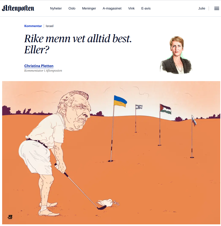 Selv illustrasjonen til «analysen» viser Witkoff på golfbanen, der flaggstengene som markerer hullenes plassering ikke er toppet med hvite vimpler som i golf, men toppet med henholdsvis et russisk, et ukrainsk, et palestinsk og et israelsk flagg. Witkoff har golfkøllen klar. Ikke mot en golfball, men mot en fredsdue.