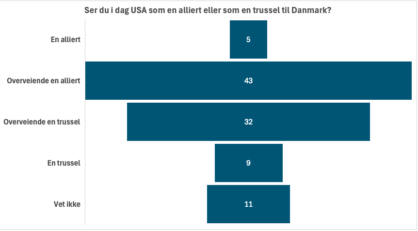 Bedre blir det ikke når det stilles spørsmål ved hvordan danskene stiller seg til USA, som en alliert eller en trussel. Under halvparten (48 pst) anser USA som «en alliert» (5 pst) eller «overveiende en alliert», mens hele 41 prosent av danskene går så langt at de anser USA som en trussel mot Danmark. 9 prosent konkluderer med «en trussel», mens 32 prosent sier «overveiende en trussel».
