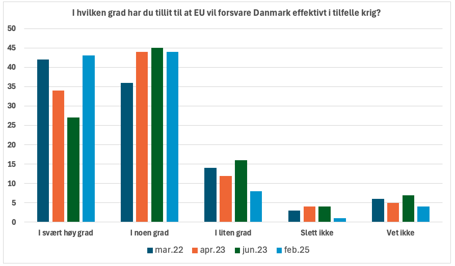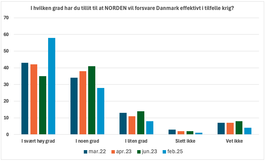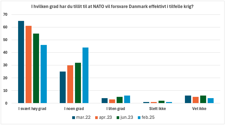 Også danskene tillit til den transatlantiske forsvarsalliansen har avtatt betydelig. Mens 65 prosent av danskene i mars 2022 hadde en «svært høy grad» av tillit til at NATO effektivt ville forsvare Danmark effektivt i tilfelle krig, sier bare 46 prosent av danskene det samme i dag. Stadig flere dansker faller imidlertid ned på «i noen grad», så samlet sett er resultatet det samme i mars 2022 og februar 2025, med 90 prosent.